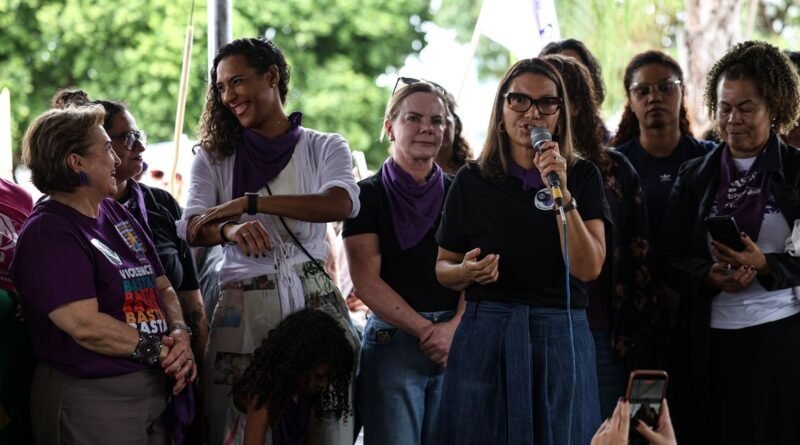 Em sua fala, a primeira dama Janja Lula da Silva lamentou os feminicídios e pediu medidas mais duras contra o assassinato de mulheres.